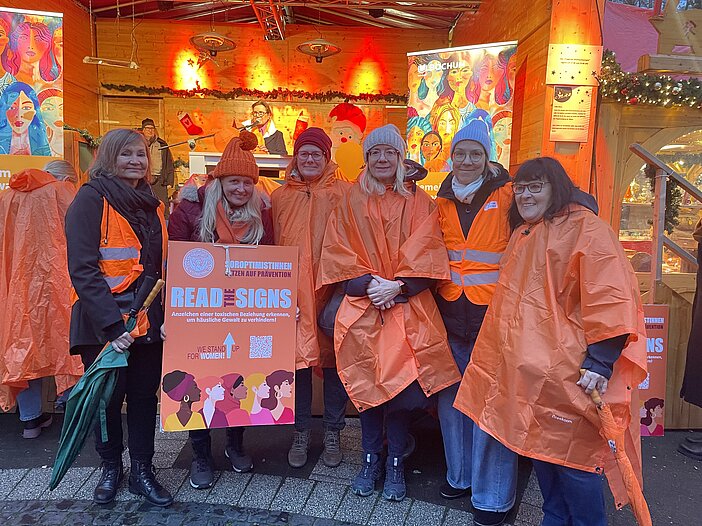 Trotz Regen ein starkes Zeichen gegen Gewalt an Frauen in Bochum gesetzt: Clubschwestern beim Orange Day 2024. Catcalls of Bochum wanderte mit und kreidete die verbale Gewalt auf dem Asphalt an.